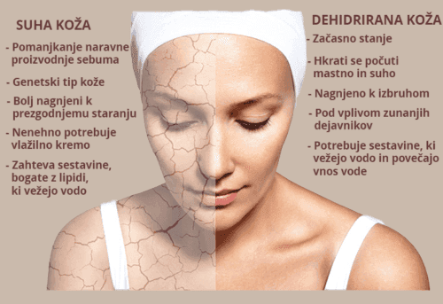 Dehidrirana koža, po drugi strani, označuje stanje kože, ki ji primanjkuje vode. To pomeni, da koža izgubi vlago in postane dehidrirana. Izsušena koža je lahko posledica izpostavljenosti soncu, staranja, uporabe neustreznih izdelkov za nego kože ali vremenskih razmer.